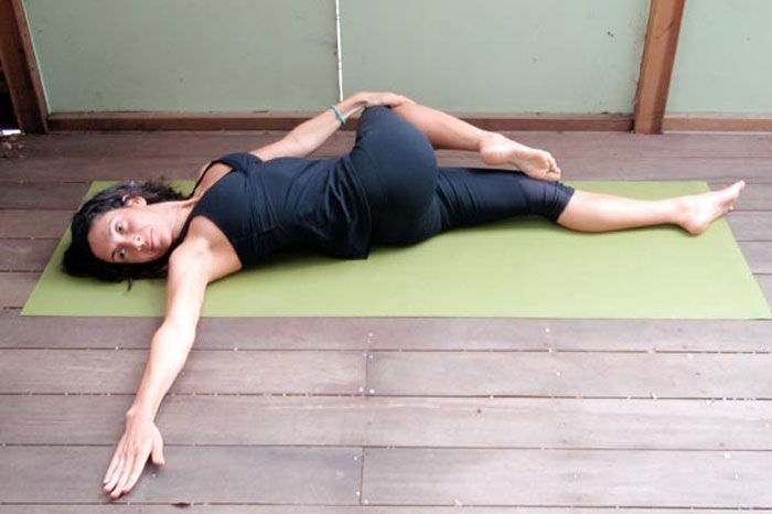 Skręć prawą nogę w lewą stronę i przytrzymaj prawe kolano lewą ręką. Druga noga musi zostać wyprostowana, a głowę skręć w prawo. Przytrzymaj chwilę i zmień stronę.