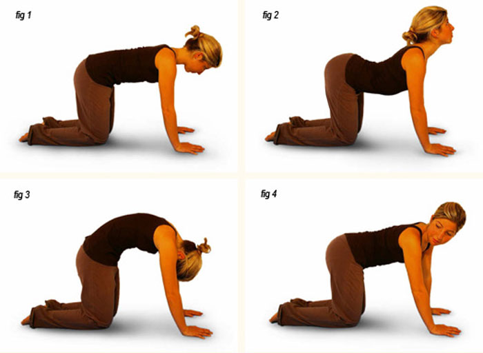 Wykonaj klęk z podporem. Ręce umieść pod barkami i na przemian wypychaj plecy raz w górę, a raz w dół.