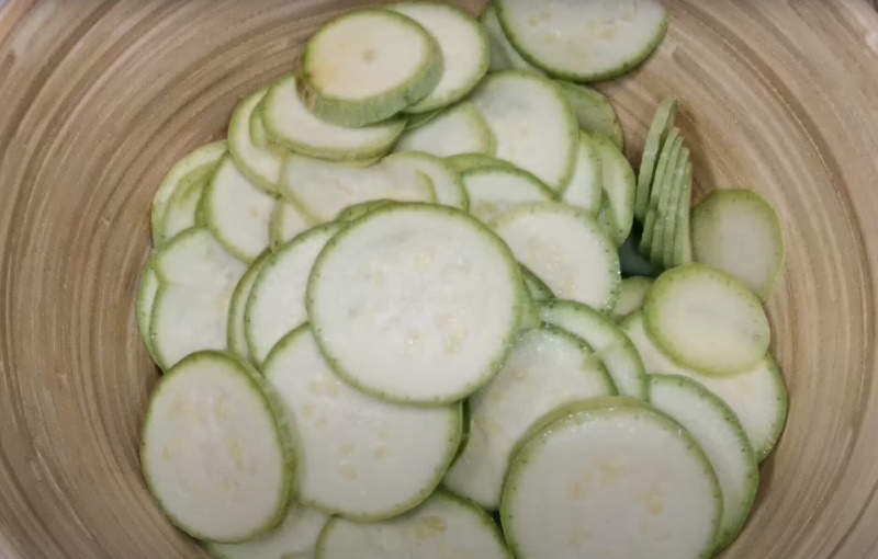 Cukinię pokrój na cienkie plastry. Najlepiej użyć cukinię młodą, aby jej środek był pozbawiony pestek. Jeśli masz dużą cukinię przekrój ją na dwie połówki po przekątnej. Warzywa włóż do wysokiej miski, obsyp solą, wymieszaj i odstaw na okres 30 minut.