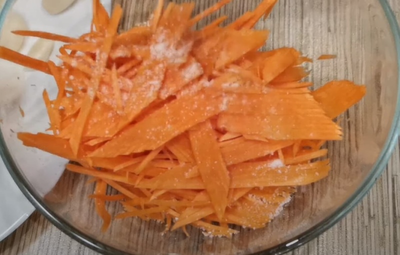Marchewkę obierz i jeśli posiadasz tarkę do przygotowania potraw po koreańsku możesz jej użyć. Jeśli nie, pokrój ją w paski za pomocą noża, umieść w oddzielnej misce i dodaj szczyptę soli. Wymieszaj dobrze i odstaw na 30 minut.