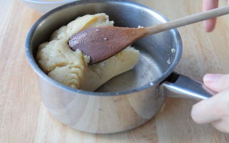 Podgrzej 250 ml wody i masło w małym rondelku na średnim ogniu. Dodaj przesianą mąkę do rondla. Mieszaj ciągle drewnianą łopatką, aż uzyskasz gładkie, kremowe ciasto.