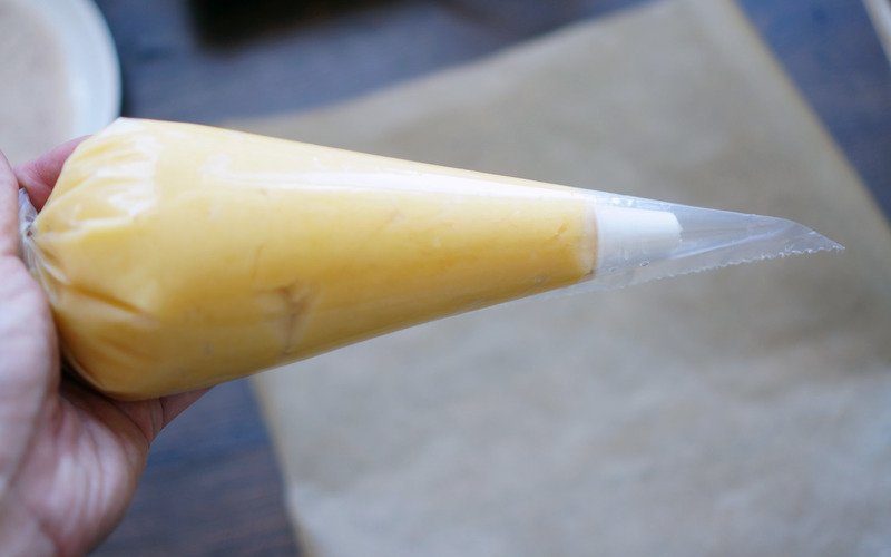 Wmieszaj masę jajeczną. Za pomocą szpatułki oddziel jajka. Przełóż masę do woreczka.