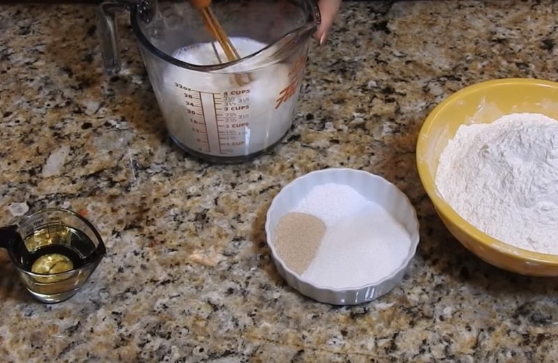 Ciepłe płyny (powinny mieć około 40 stopni, aby prawidłowo rozpuściły się drożdże) wymieszaj razem.