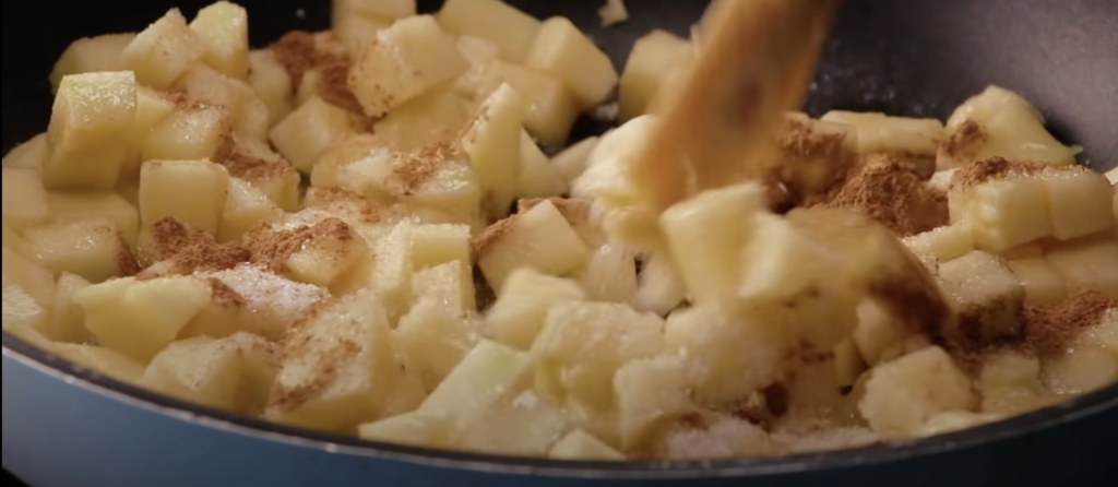 Na patelni rozpuszczamy masło, wsypujemy jabłka i doprawiamy je cynamonem oraz cukrem.