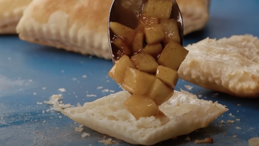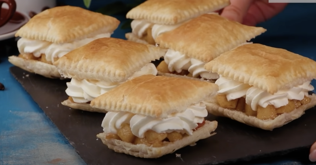 Przygotowane jabłka nakładamy na jedną część ciasta, nakładamy krem budyniowy i przykrywamy drugą warstwą ciasta.