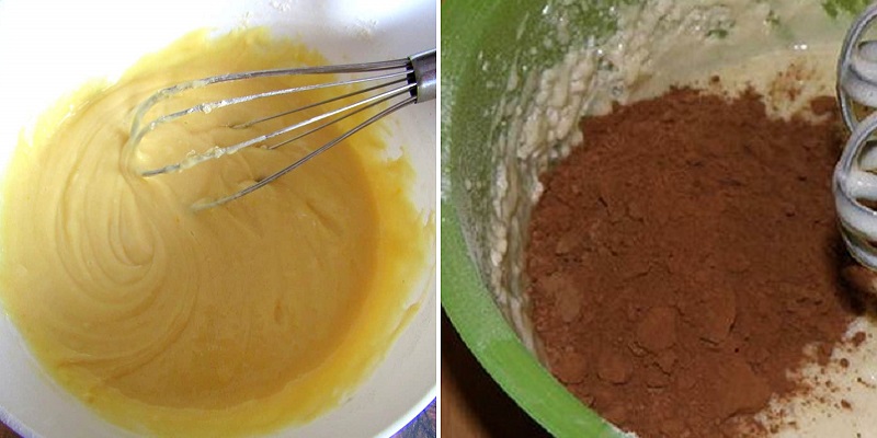W większym garnuszku rozpuścić 100 g masła, a następnie dodać do niego cukier oraz jedno opakowanie cukru wanilinowego. Dodać jedną łyżkę kakao i wymieszać do momentu otrzymania gładkiej masy. Następnie, dodać jedno jajko i ponownie wymieszać.
