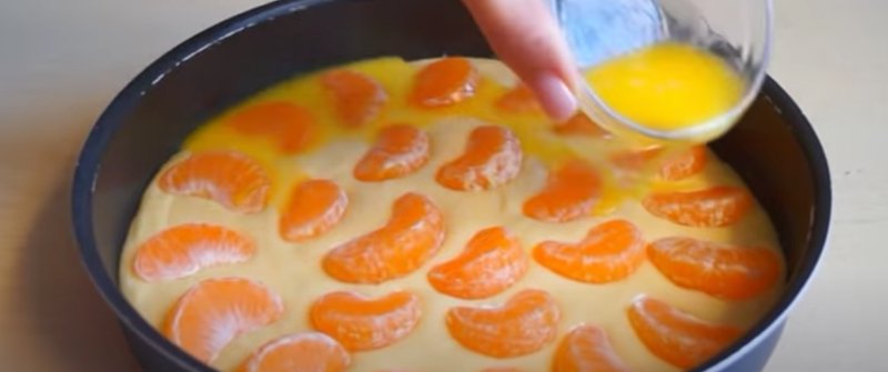 Na cieście ułożyć plasterki mandarynek. Później polać roztopioną drugą częścią masła. Na wierzch można dodać pozostałe dwie łyżki cukru.