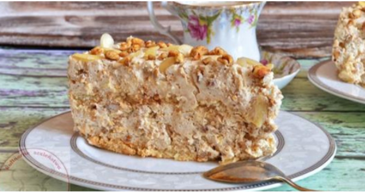 Pyszny deser kawowy z kremem i orzechami. Ciasto jest smaczne i szybkie w przygotowaniu. Wygląda pięknie i nie wymaga pieczenia.