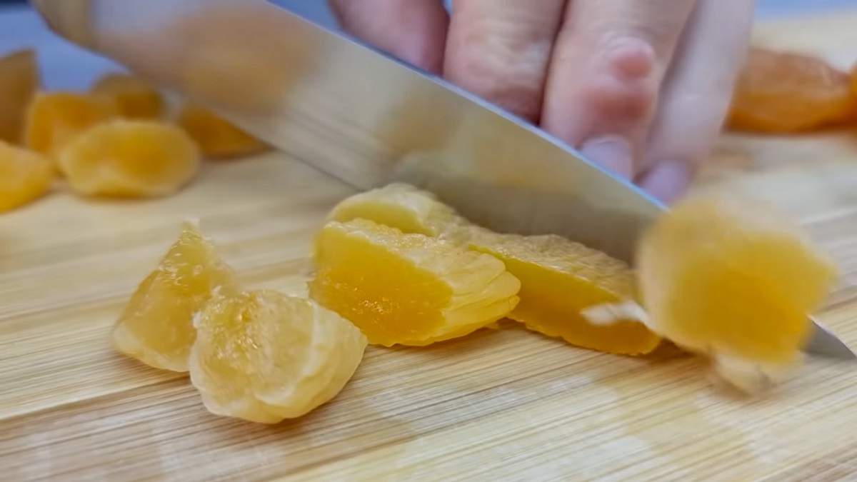 Następnie wszystkie większe składniki dokładnie posiekać na mniejsze kawałki. Wymagają tego szczególnie suszone morele, śliwki oraz orzechy włoskie. Krakersy można pokruszyć na mniejsze części.