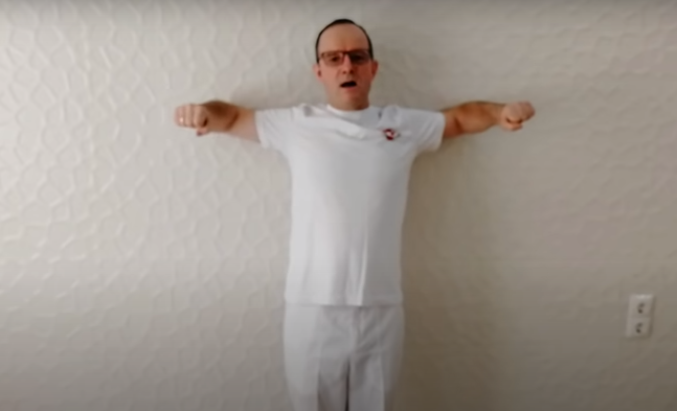 Oprzyj się plecami o ścianę, tak aby między wami była tylko niewielka przestrzeń. Ramiona powinny być przyciśnięte do ściany. Połóż ręce tak, aby łokcie i tułów dłoni były pod kątem prostym. Podczas wydechu łokcie powinny być dociśnięte do ściany. Powtórz ćwiczenie 15-20 razy.