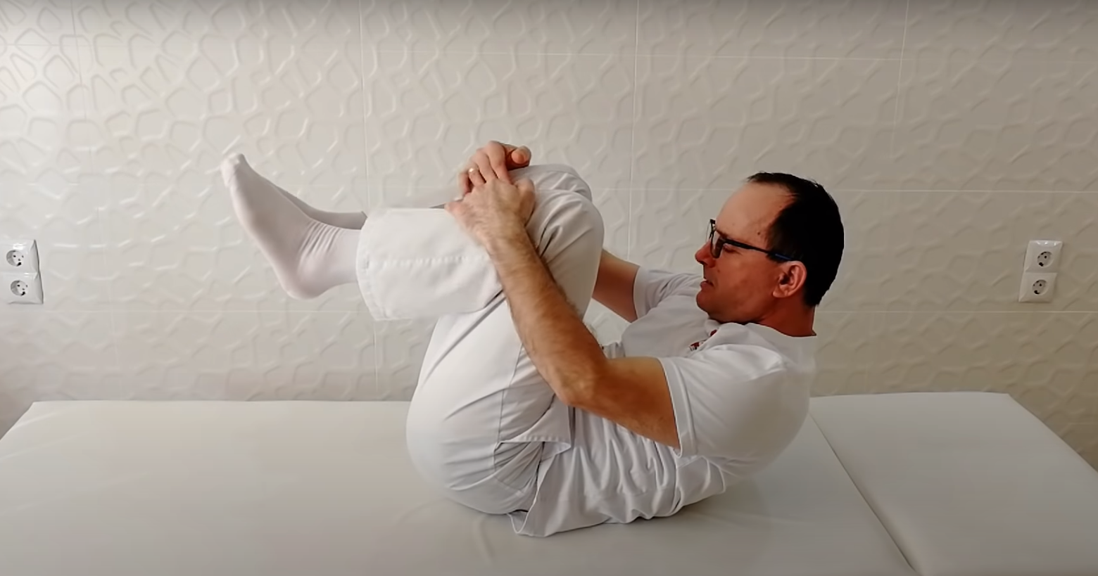 Połóż plecy na ziemi. Połóż ręce na kolanach i mocno chwyć dłonie. Przyciągnij kolana do klatki piersiowej. Powtórzcie to ćwiczenie 15-20 razy. Podczas tego ćwiczenia należy zwracać uwagę na oddychanie przeponowe.