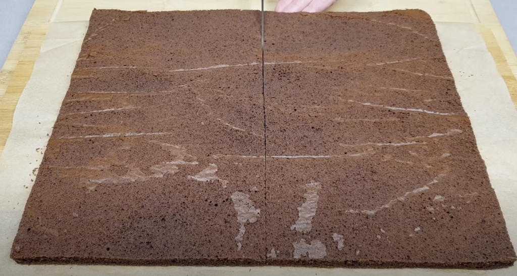 Jeśli upiekło się dobrze, odstawiamy je do studzenia. Następnie, zdejmujemy ostrożnie papier do pieczenia i kroimy nożem ciasto na 4 równe kawałki, wyrównujemy nawet boki, jeśli jest to konieczne.