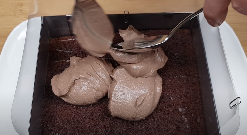 A teraz układamy jedną cześć ciasta na blaszce, a na nim rozprowadzamy 1/3 kremu. Nakładamy na to drugą część ciasta, którą lekko dociskamy i znów na to 1/3 masy kremu. Powtarzamy jeszcze 2 razy i całość ląduje w lodówce.