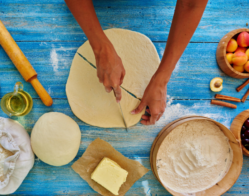 Gdy ciasto będzie już gotowe, podziel je na trzy równe części. Każdą część ciasta rozwałkuj na około 0,5 cm, formując je w kształt okręgu. Kawałki ciasta pokrój w 8 kawałków tak, jakbyś kroiła pizzę.