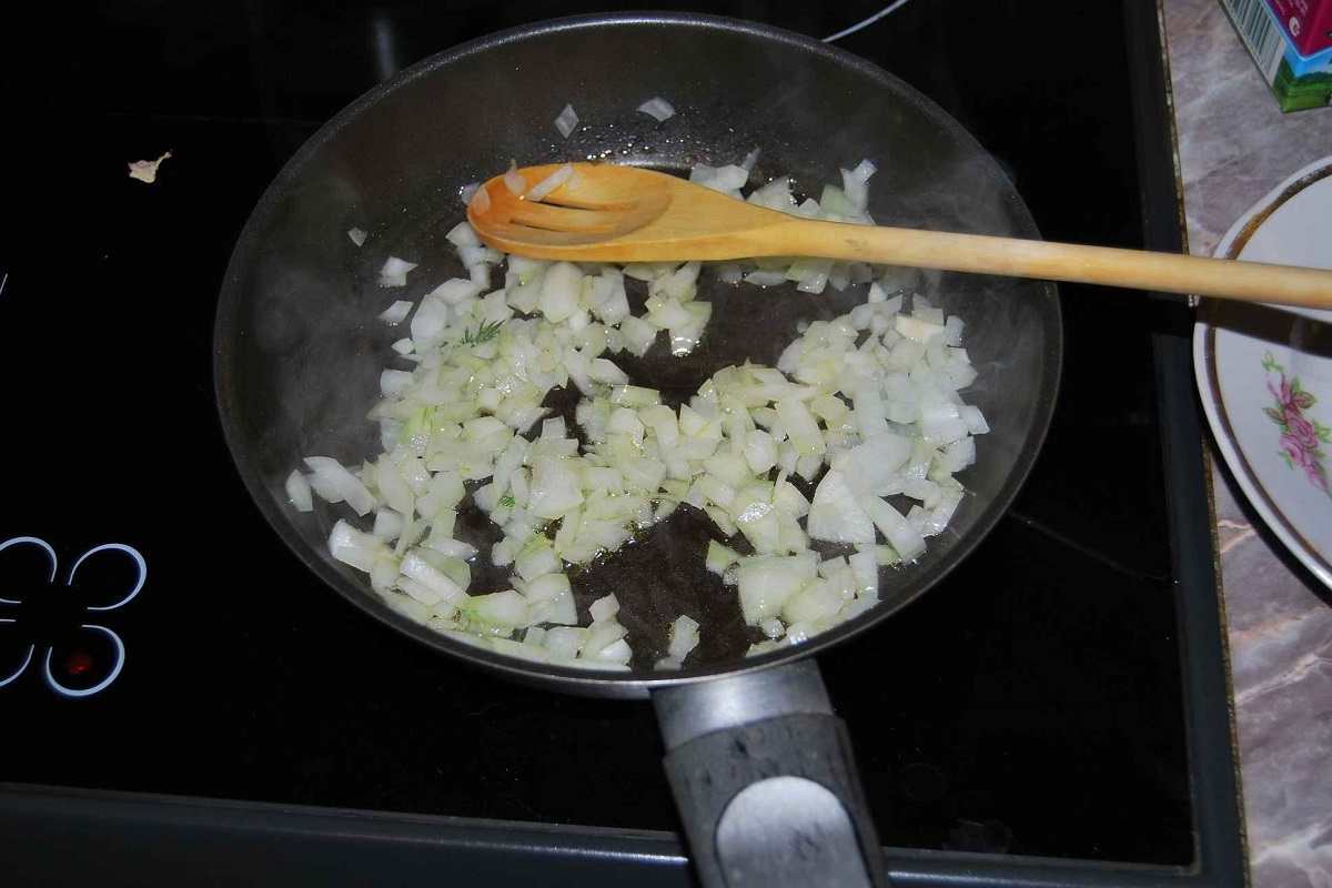 Przejdź do przygotowania farszu. Do jego zrobienia potrzebna Ci będzie obrana i posiekana cebula, którą następnie podsmażysz na patelni na maśle.