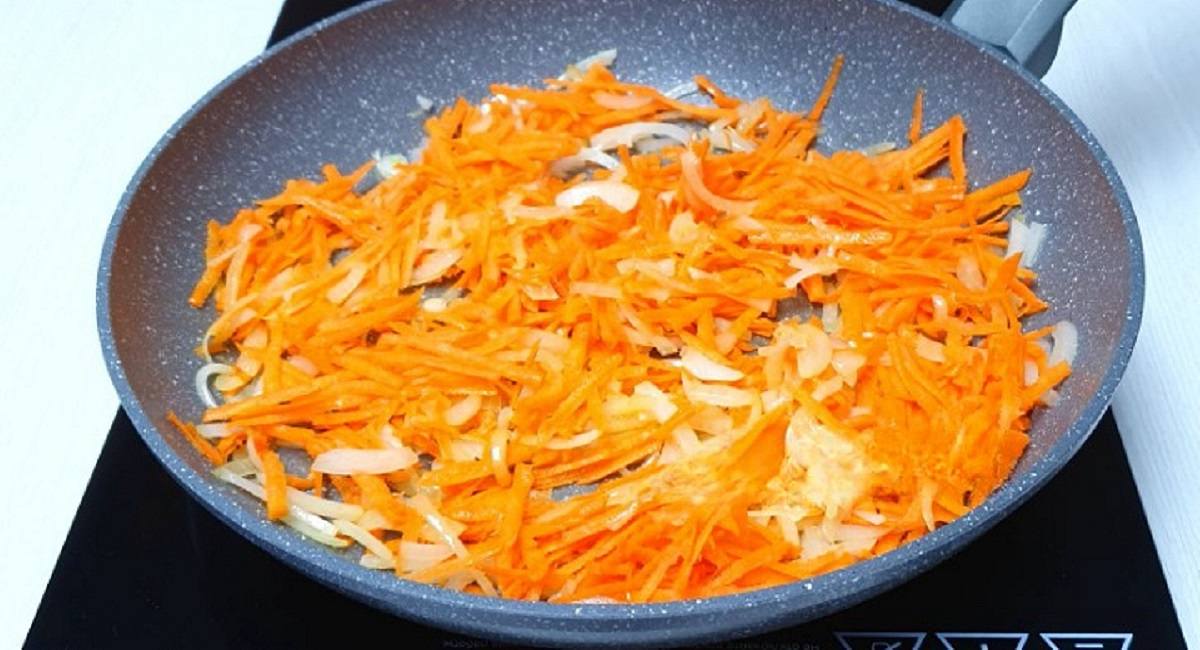 Cebulę i marchew obierz. Cebulę pokrój w półksiężyce, a marchew zetrzyj na grubych oczkach tarki. Olej słonecznikowy rozgrzej na patelni, wrzuć warzywa i podsmaż.