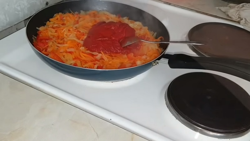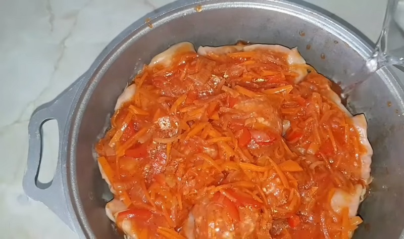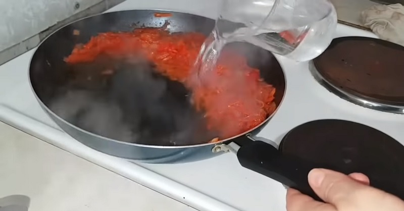 Z tak przygotowanych warzyw połowę przełóż i dodaj do mieszanki ryżu i mięsa, a z drugiej połowy przygotuj sos. Aby zrobić sos, do połowy warzyw, która została na patelni, dodaj sól, pieprz i pół litra wody. Doprowadź do wrzenia i ostudź mieszaninę.