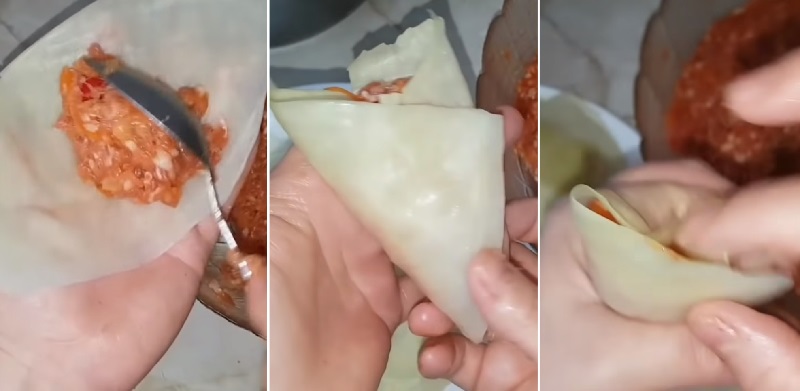 Wymieszaj nadzienie i zabierz się za gołąbki. Niewielką ilość mięsa włóż w liść kapusty, a następnie zawiń go w trójkąt, górę liścia chowając do środka.