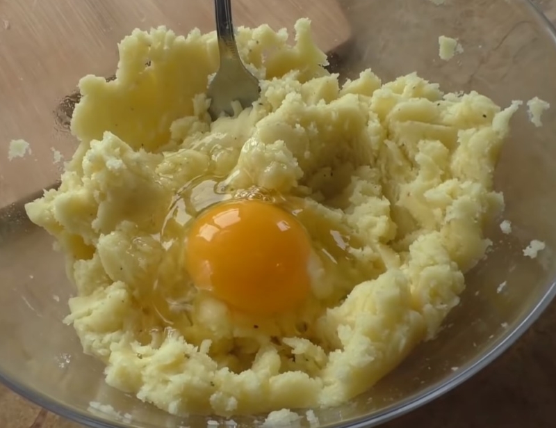 Do naczynia z puree ziemniaczanym dodajemy masło i wbijamy jajko. Masę dokładnie mieszamy. Następnie doprawiamy solą i pieprzem i ponownie mieszamy składniki.