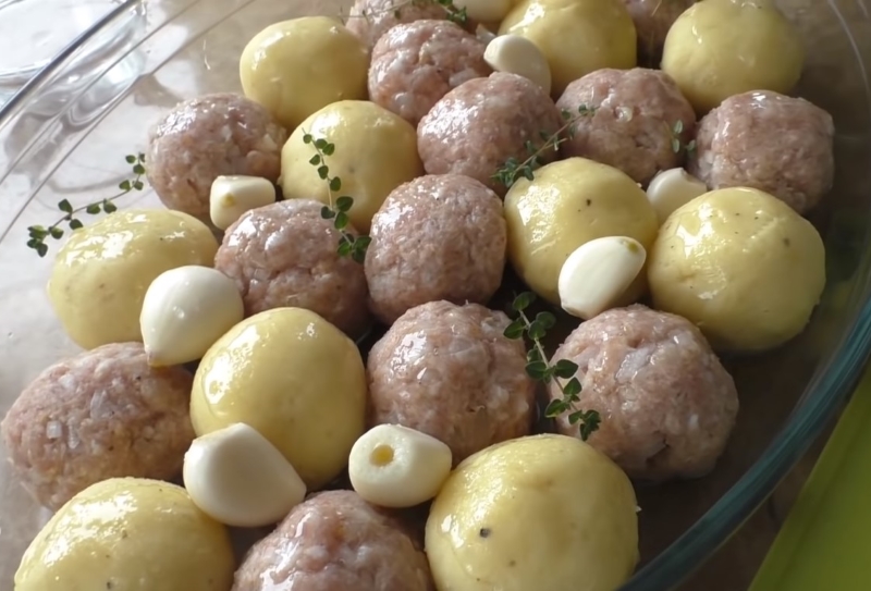Obrane ząbki czosnku układamy między gotowymi kulkami. Całą potrawę posypujemy listkami świeżego tymianku lub innymi ulubionymi przyprawami.