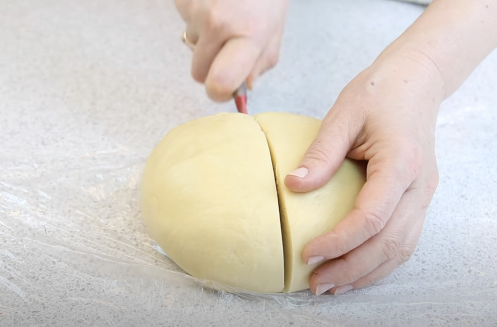 Następnie owiń ciasto folią spożywczą i włóż do lodówki. Ciasto powinno pozostać w lodówce przez około 40 minut. Wyjąć i podzielić ciasto na dwie części.