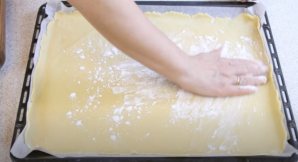 Na blasze wyłożonej papierem do pieczenia rozwałkuj ciasto. Możesz podsypać ciasto mąką lub skrobią.