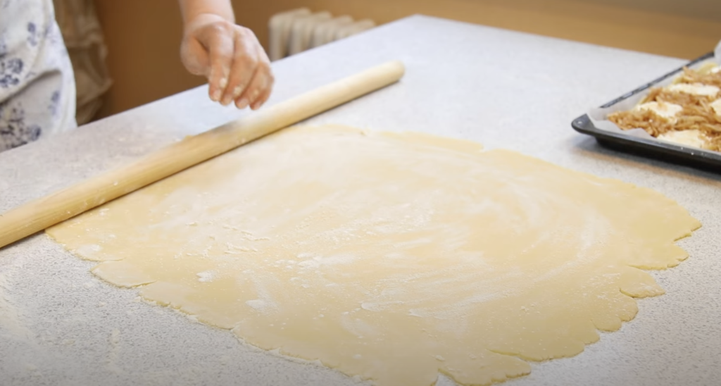 Posyp stolnicę mąką, a następnie rozwałkuj połowę ciasta.