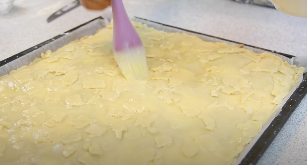 Drugą połowę ciasta należy rozwałkować i położyć na wierzchu nadzienia. Jeśli ciasto przykleja się do brzegów formy, najlepiej delikatnie usunąć je nożem i położyć na wierzchu. Pamiętaj, aby nakłuć ciasto widelcem, a następnie posmarować je roztrzepanym jajkiem.