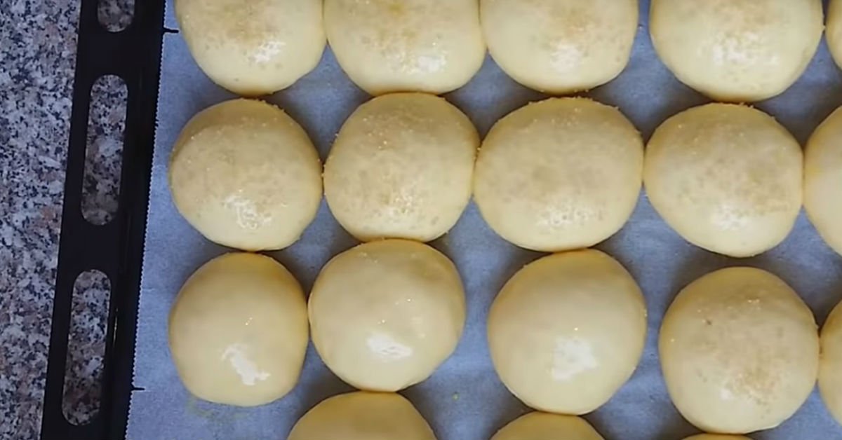 Podpiecz blachę na papierze do pieczenia. Ułóż bułeczki jedna na drugiej na blasze do pieczenia. Podczas pieczenia urosną. Ułóż bułeczki na blasze do pieczenia i przykryj ręcznikiem. Niech odpoczną przez 15 minut. Po 15 minutach posmaruj bułeczki lekko białkiem jajka, a następnie posyp cukrem.