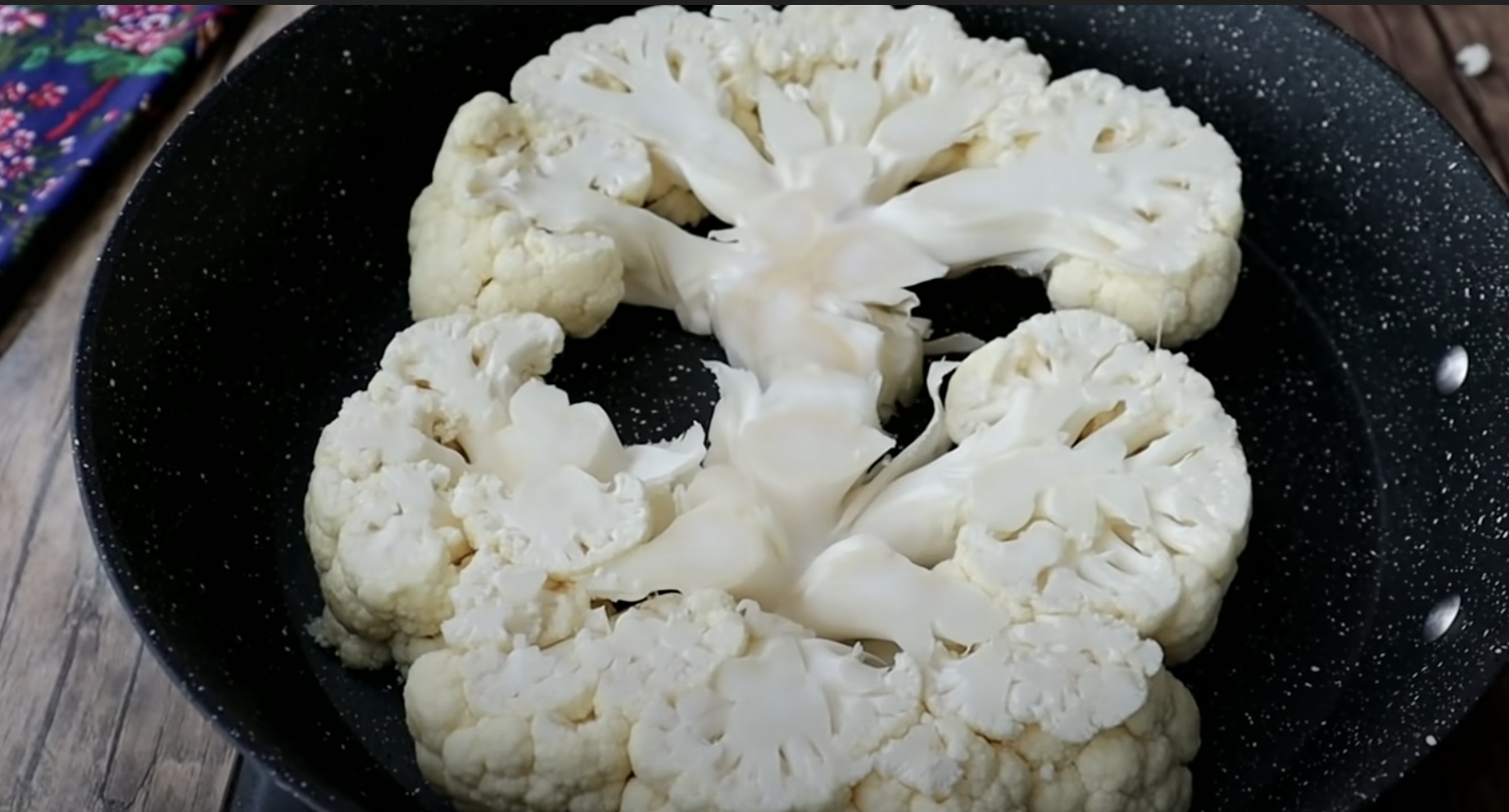 Szklankę wody wlewamy na patelnie i czekamy aż się zagotuje. Kawałki kalafiora gotujemy przez około 8 minut.