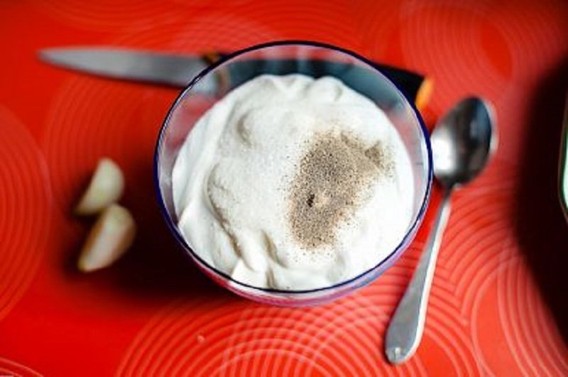 W osobnej miseczce należy połączyć majonez z jogurtem, uprzednio przeciśniętym czosnkiem oraz pieprzem. Siekamy koperek.