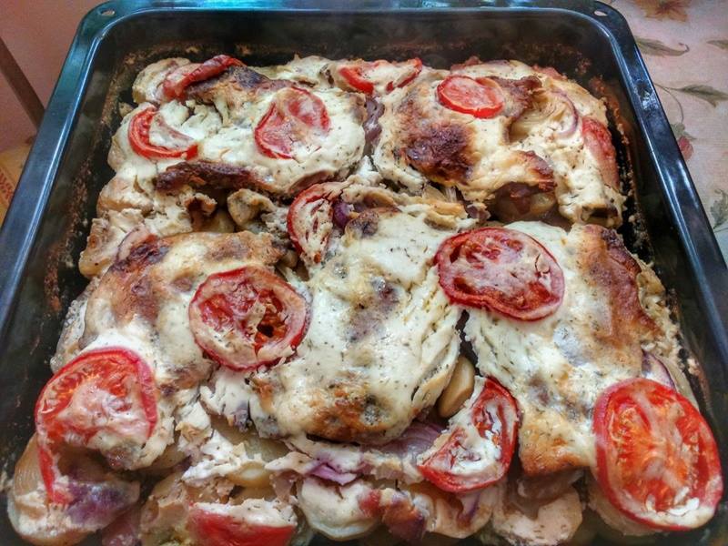 Po upływie godziny, gdy mięso z ziemniakami i dodatkami będzie już gotowe, zalewamy je sosem i wkładamy do piekarnika na jeszcze kilka minut. W zależności od upodobań- możesz dorzucić inne warzywa: tak, aby zarówno miłośnicy mięsa, jak i warzyw mogli delektować się przepisem.