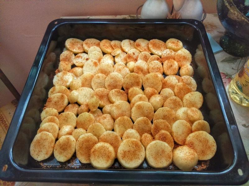 Blaszkę wykładamy papierem do pieczenia i układamy na niej pokrojone w plasterki ziemniaki. Smarujemy je cienką warstwą przygotowanej marynaty. W reszcie marynaty marynujemy mięso. Zostawiamy na minimum 30 minut.