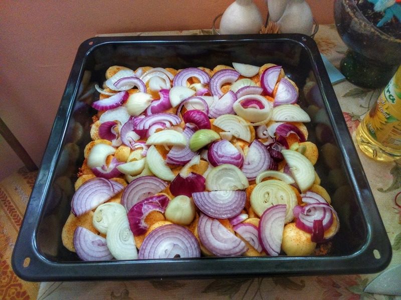 Boczek kroimy w kostkę, cebule w piórka lub krążki. Składniki te kładziemy na ziemniakach.