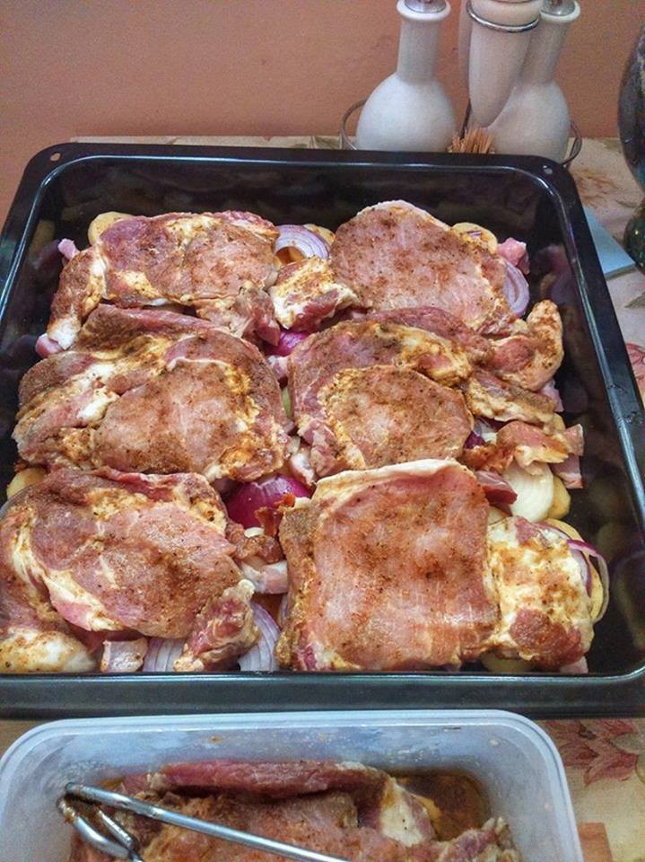 Na sam wierzch kładziemy zamarynowaną karkówkę. Blachę zakrywamy folią aluminiową i wkładamy do piekarnika. Danie pieczemy w 200 stopniach przez około godzinę.