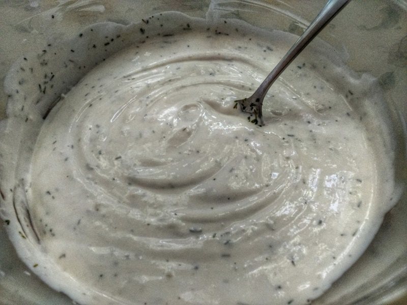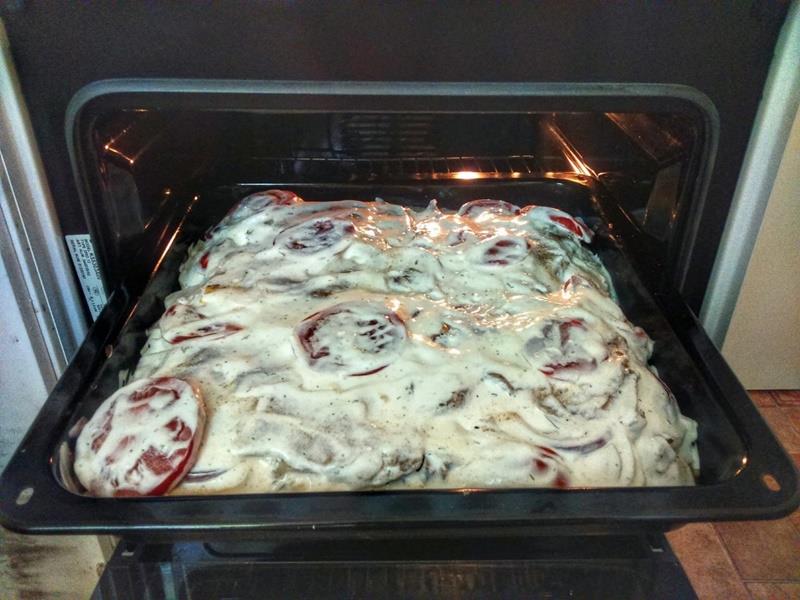 Kiedy mięso z dodatkami się piecze, zajmujemy się przygotowaniem sosu. Ząbki czosnku przeciskamy przez praskę. Śmietanę (można ją zastąpić jogurtem naturalnym) mieszamy z przeciśniętymi ząbkami czosnku. Dodajemy sól, pieprz, czosnek i inne ulubione przyprawy: suszone zioła doskonale pasują.