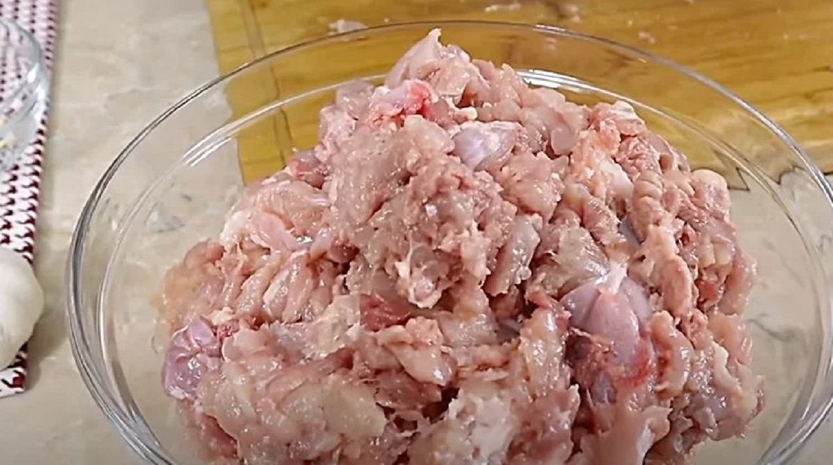 Drobiowe mięso umyć i osuszyć. Ostrym nożem odciąć mięso od kości, wrzucić je do garnka z wodą i ugotować. Ugotowane i ostudzone mięso posiekać na drobne kawałki lub zmielić maszynką.