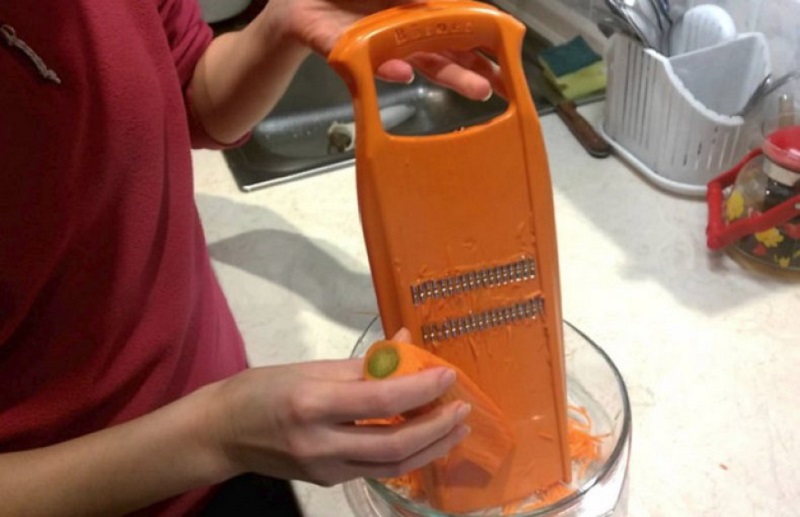 Marchew najpierw dokładnie opłucz pod bieżącą wodą i obierz, a następnie zetrzyj na tarce tak, by otrzymać możliwe długie paski. Długość jest istotna, ponieważ nadaje estetyki całej przystawce lub potrawie.