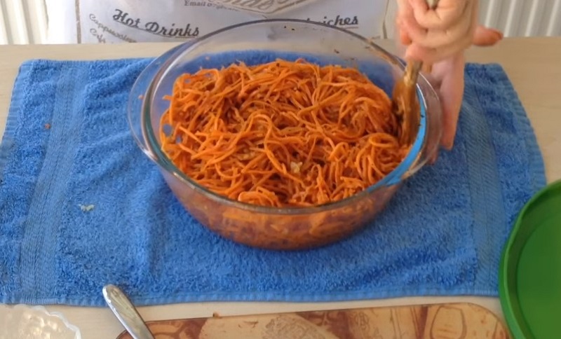 Teraz wystarczy dodać posiekany wcześniej czosnek, oraz dorzucić kilka zmiażdżonych nasion kolendry. Najlepszy efekt i smak uzyskuje się wówczas, gdy marchew jeszcze trochę odpocznie.