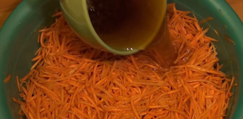 Na rozgrzaną patelnie wlej olej roślinny- dosłownie na chwilę, tak by nie zaczął wrzeć ale nabrał wyższej temperatury niż otoczenie. Ciepły olej od razu wlej do miski z marchwią i starannie wymieszaj, może być łyżką, w pierwszej chwili olej może być nazbyt ciepły.
