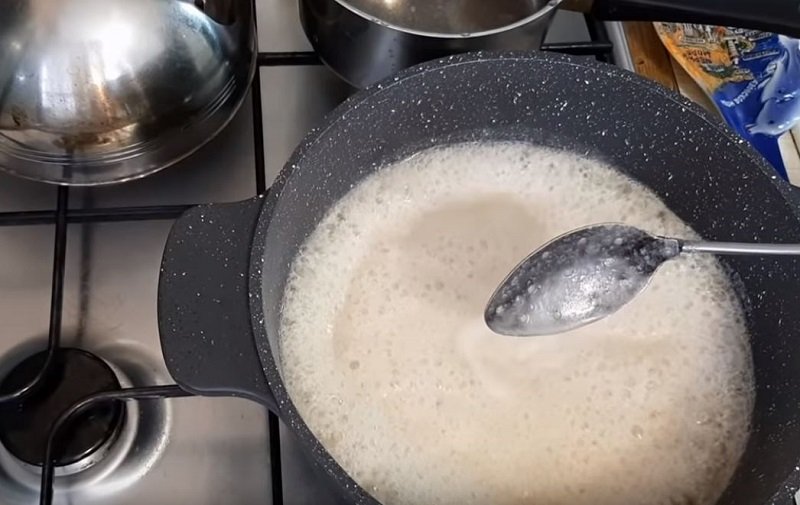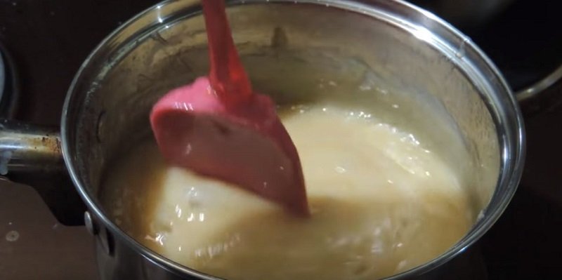 Kolejnym krokiem będzie zagrzanie mleka w osobnym garnuszku, a potem dodanie go do gorącego cukru. Wszystko mieszamy ze sobą za pomocą szpatułki.