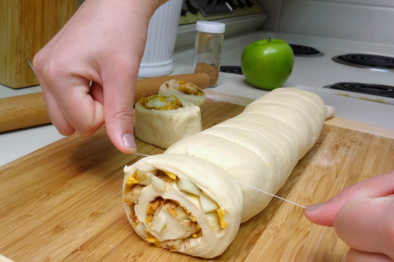 Jeśli podczas przygotowania dania z miękkiego ciasta zmienia ono formę przy cięciu nożem, do porcjowania możesz użyć nici dentystycznej.