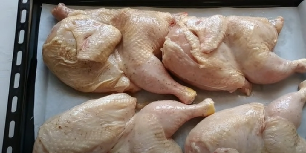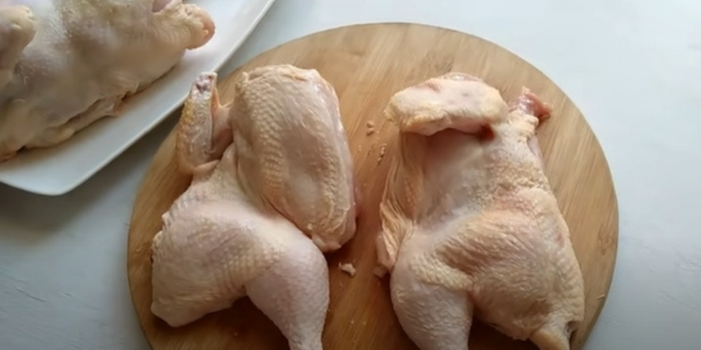 Kurczak dokładnie umyj pod bieżącą wodą i osusz. Odetnij końcówki skrzydełek i szyję. Przekrój go na pół.