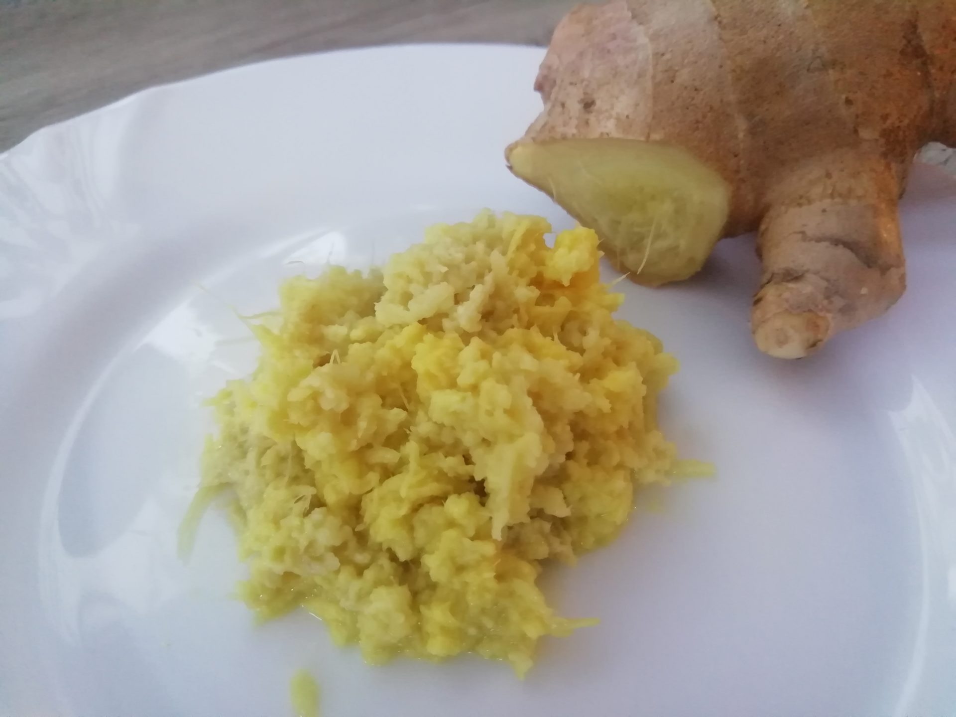 Kawałek imbiru oczyścić i zetrzeć na drobnej tarce (można też rozdrobnić go w moździerzu).