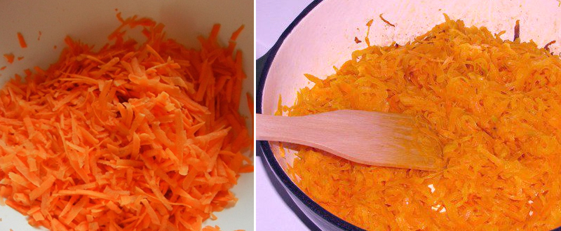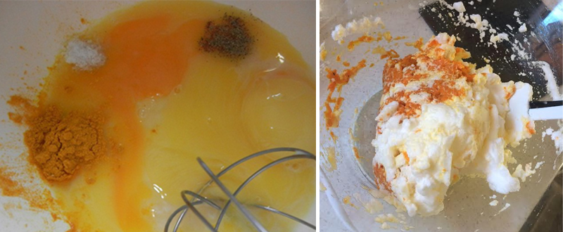 Osobno ucieramy żółtka z przyprawami. Obie jajeczne mikstury łączymy z wystudzoną marchwią, delikatnie mieszając. Ciasto powinno mieć lekką, półpłynną konsystencję.