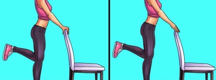 Przytrzymaj się krzesła obiema rękami. Unieś kolano tak, aby łydka i udo były w jednej linii. Unieś kostkę drugiej nogi tak, aby ciężar ciała został całkowicie przeniesiony na palce stóp. Podnosimy ręce razem z kostką, aż palce stóp będą proste.