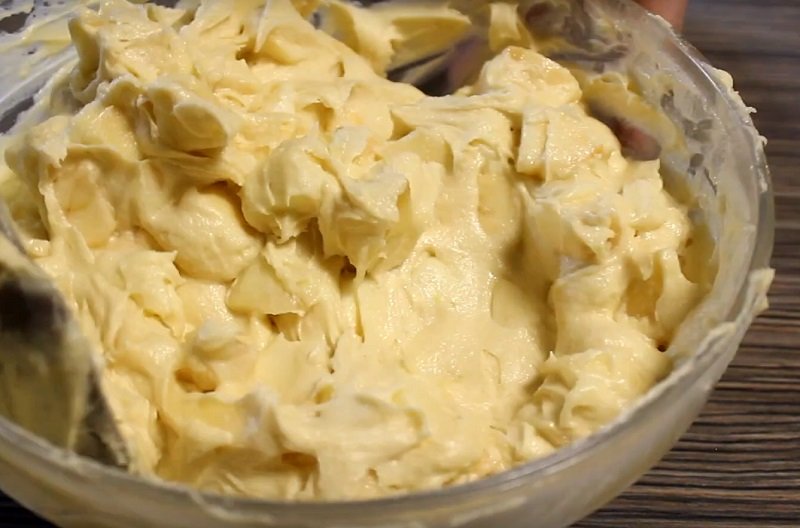 Zmiksuj jajka jedno po drugim, dodając je w miarę upływu czasu. Wymieszaj mąkę z płynną mieszanką. Wyrobić ciasto. Wmieszaj przygotowane wcześniej jabłka.