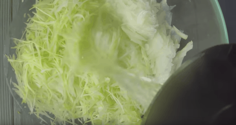 Na drobnej tarce ścieramy w pierwszej kolejności 300 g kapusty oraz 75 g cebuli. Ewentualnie możemy również posiekać nożem ale tak aby były posiekane bardzo drobno. Oba składniki wkładamy do głębokiej miski. Następnie zalewamy wrzątkiem i odstawiamy na 2 minuty.