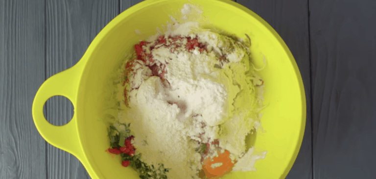Następnie dodajemy 1 jajko, 2 łyżki kwaśnej śmietany (ewentualnie majonez), 1 łyżeczkę soli, 1/2 łyżeczkę czarnego pieprzu, 1/2 łyżeczki sody oraz 3 łyżki mąki. Całość mieszamy rękami.