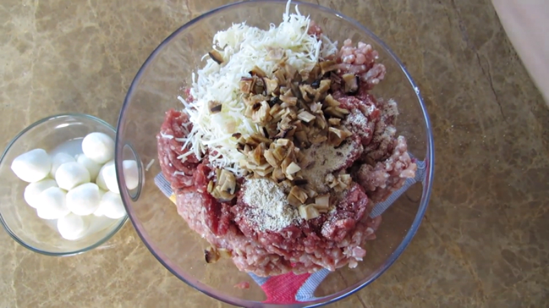 Oba rodzaje mięsa dokładnie połącz, dodaj pokrojone i przesmażone lekko pieczarki, dopraw solą i pieprzem. Na koniec wrzuć starty ser i pietruszkę. Całość dokładnie wymieszaj ręką.